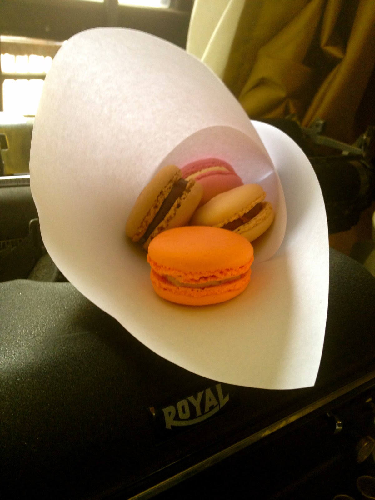 French Macarons: Orange for Bourbon Pecan, Pink for Raspberry Lemonade, Brown for Bacon Brownie, Cream for Malted Milk Chocolate